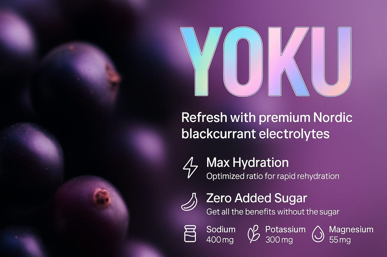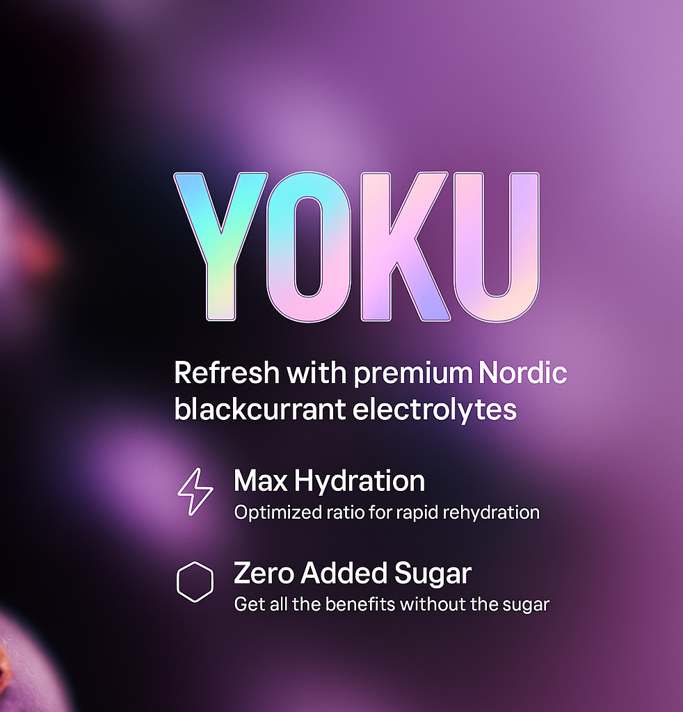 YOKU is a clean Nordic electrolyte mix made from real cold-dried blackcurrants and science-based minerals.Each serving delivers optimal hydration with sodium, potassium, and magnesium, without added sugar or artificial ingredients.Just mix with cold water for a refreshing, functional drink designed for training, recovery, sauna, and daily hydration.